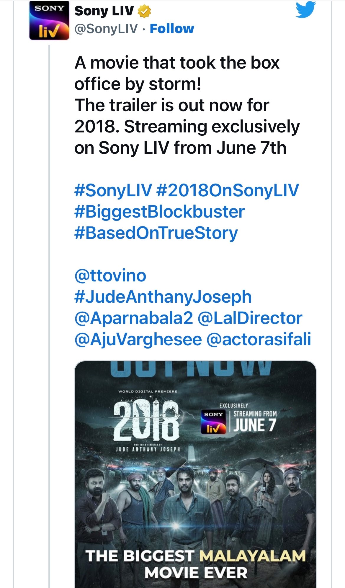 The all-time biggest blockbuster of Malayalam cinema, 2018 will be available to stream on SonyLIV from June 7. Even as the film is doing well in theatres, the streaming platform has decided to release it.