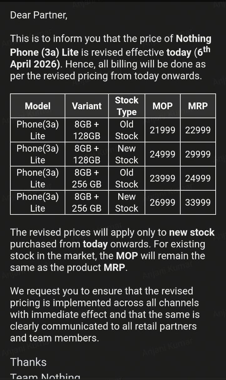 Nothing has raised the price of the Phone (3a) Lite by Rs. 3,000 in India, so it will cost more for new buyers. The new prices apply to all storage options. Current stock will still be sold at the old price, but once new stock arrives, the higher price will take effect.