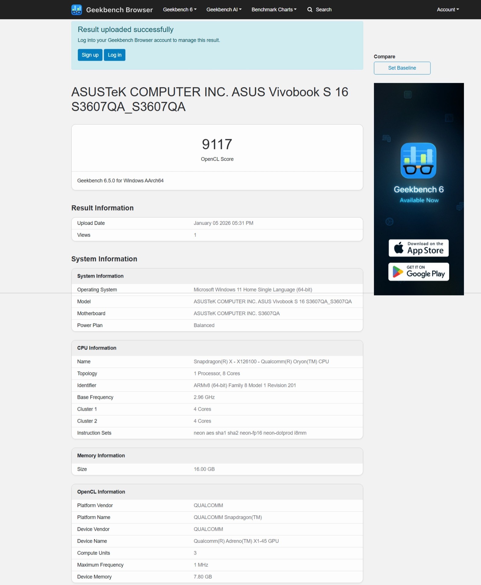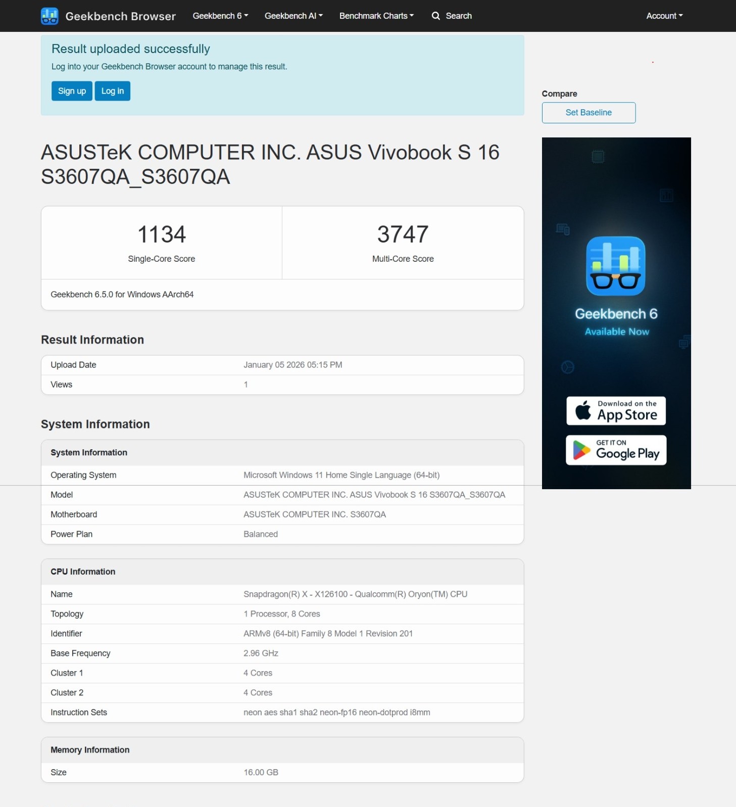 We have been using the Asus Vivobook S16 as our daily work laptop for over two weeks. The performance has been smooth and reliable for everyday tasks. The laptop is powered by the Snapdragon X (X1 26 100) processor, which comes with 8 cores and 8 threads, a 30MB cache and clock speeds of up to 2.97GHz. On the memory side, you get 16GB of LPDDR5X RAM clocked at 8448MHz, which feels more than sufficient for multitasking. The 512GB PCIe Gen 4 SSD keeps boot times fast and apps loading quickly.