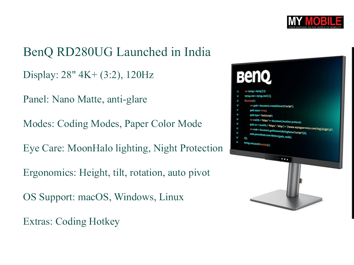 The BenQ RD280UG Programming Monitor is now available across leading gadget and IT retail stores across India, as well as on major e-commerce marketplaces, at the best available price of INR 64,990.