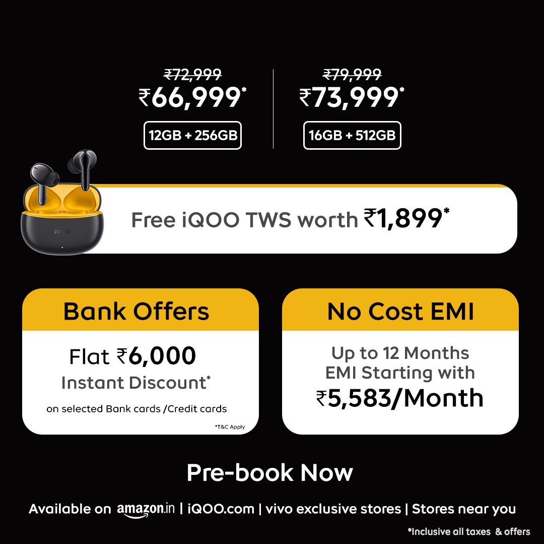 No-cost EMI options for up to 12 months on select bank cards Free iQOO TWS earbuds for early buyers and pre-booking customers Additional exchange offers on eligible devices.