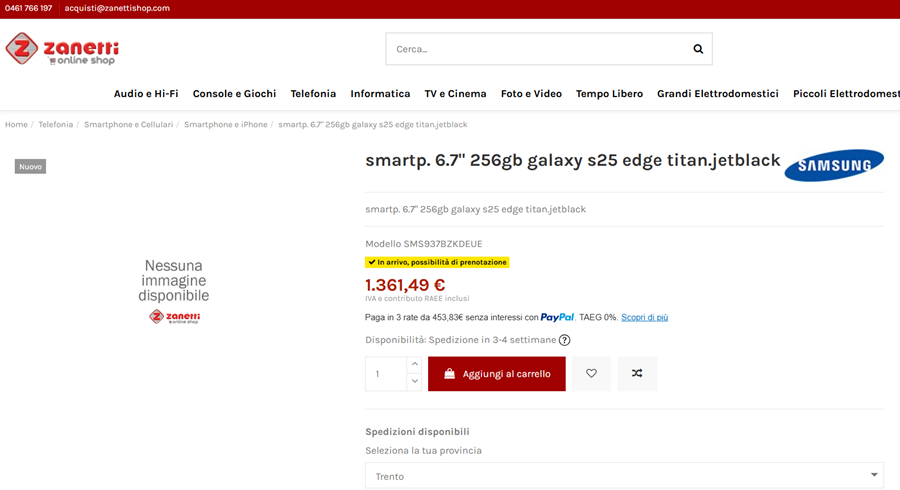 The phone has been spotted on Italian retailer Zanetti’s website, with the 256GB model listed at €1,362 and the 512GB version at €1,488. That’s more than what was originally expected in Europe. For comparison, the S25+ in the same storage options costs €1,247 and €1,372. So, the Edge is over €100 more expensive than the S25+, at least according to this listing.