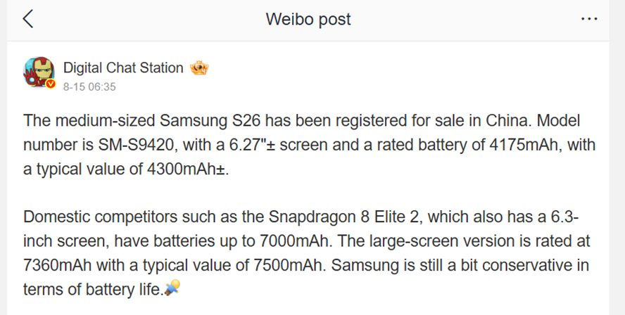 According to the famous tipster named Digital Chat Station on Weibo, the Galaxy S26 Pro may feature a 6.27-inch display alongside a 4,300mAh battery. This is the second time the same battery size has been reported in recent weeks. For comparison, the Galaxy S25 came with a 6.2-inch screen and a 4,000mAh cell.