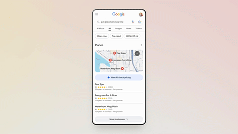 For example, if you search for “pet groomers near me,” you can tap “Have AI check pricing” and let the AI handle the inquiry. It will contact multiple businesses, ask about prices and availability, and then organise the info in a clear, comparable format.
