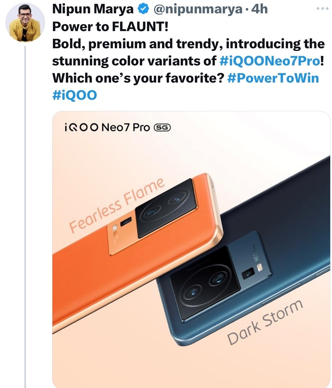 Yogesh Brar’s tweet reveals that iQOO will likely price the Neo 7 Pro smartphone at Rs 34,999 or Rs 35,999.