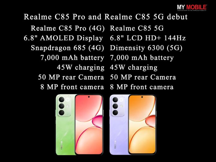 In terms of cameras, both models feature a 50MP primary rear sensor and an 8MP front camera for selfies and video calls. The Realme C85 Pro measures 164.4 × 77.99 × 8.09mm and weighs 205 grams, while the C85 5G is slightly thicker at 8.38mm and weighs 215 grams.