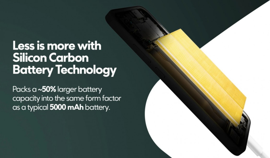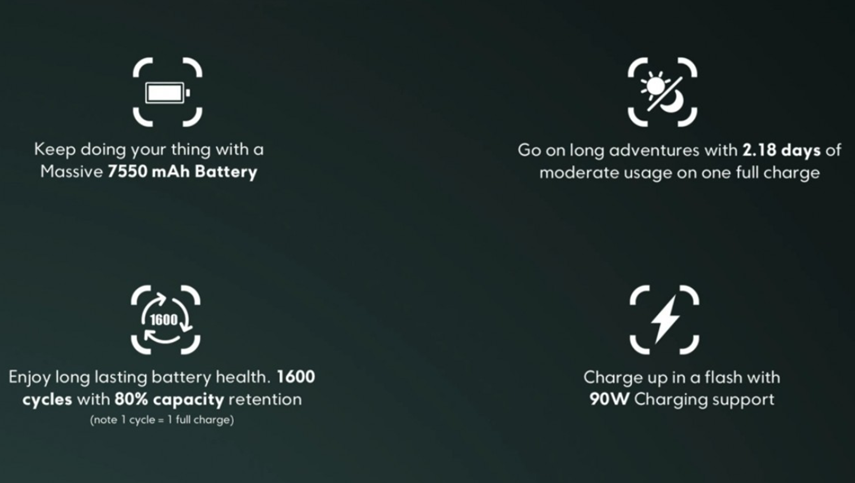 Answer. It packs a massive 7000mAh battery with Silicon Carbon Technology, offering up to 58 hours of usage and supports 33W TurboPower fast charging.