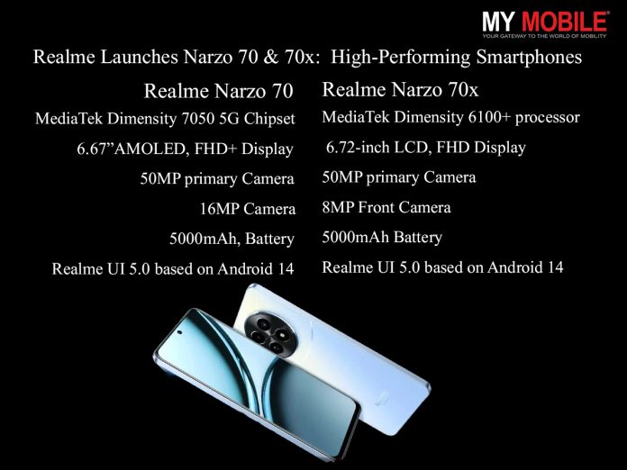 The Narzo 70x is powered by a MediaTek Dimensity 6100+ processor and sports an LCD screen, whereas the Narzo 70 features a MediaTek Dimensity 7050 and an AMOLED display.