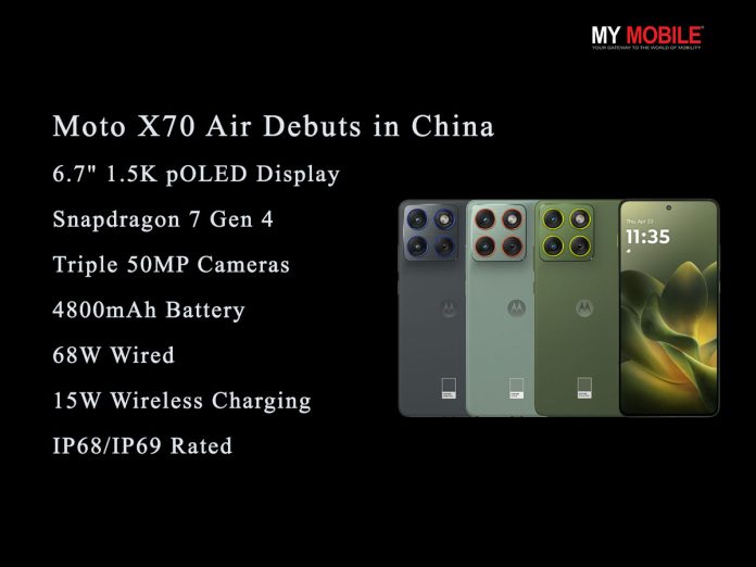 The Moto X70 Air features a 6.7-inch 1.5K (2712 × 1220 pixels) 10-bit pOLED display with a 120Hz refresh rate, Corning Gorilla Glass 7i protection, and a peak brightness of up to 4500 nits. Under the hood, it runs on the Qualcomm Snapdragon 7 Gen 4 (4nm) processor paired with Adreno 722 GPU. The phone comes with 12GB of RAM and storage options of 256GB or 512GB, and it ships with Android 16 out of the box.
