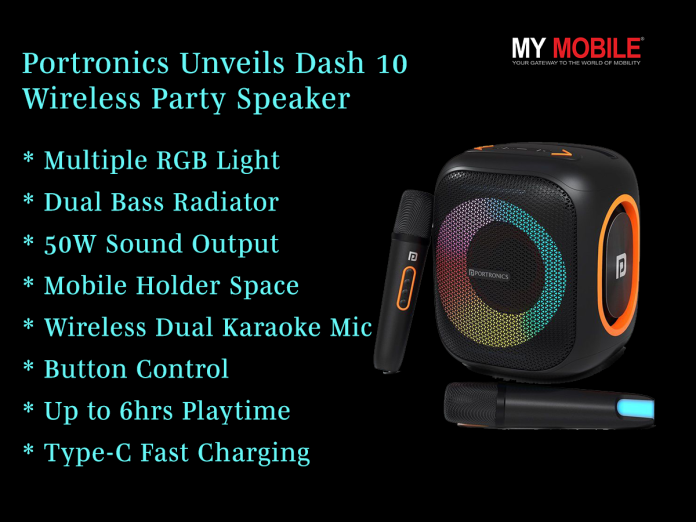 • Portronics Dash 10: 50W wireless party speaker with dual karaoke mics and RGB lights launched.