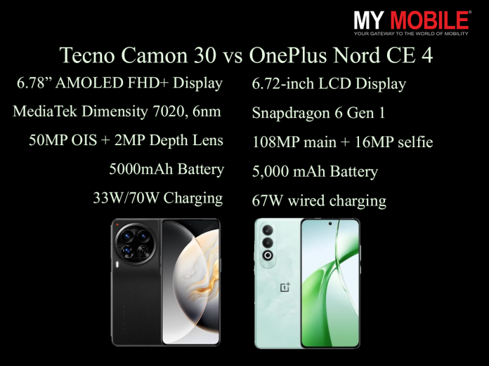 The Camon 30 Premier 5G has a 1.5K+ LTPO AMOLED display, MediaTek Dimensity 8200 chipset, and advanced camera features including 3x optical zoom and ultra-wide lens, while the Camon 30 features a standard AMOLED display and MediaTek Dimensity 7020 processor.