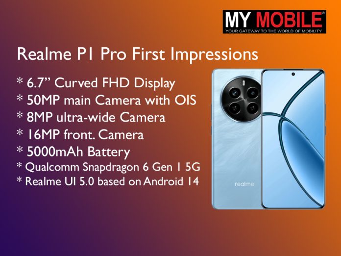 The Realme P1 Pro features a 6.7-inch curved FHD+ OLED display with a 120Hz refresh rate, Snapdragon 6 Gen 1 5G processor, a 50MP main camera with OIS, and a 5000mAh battery with 45W charging.