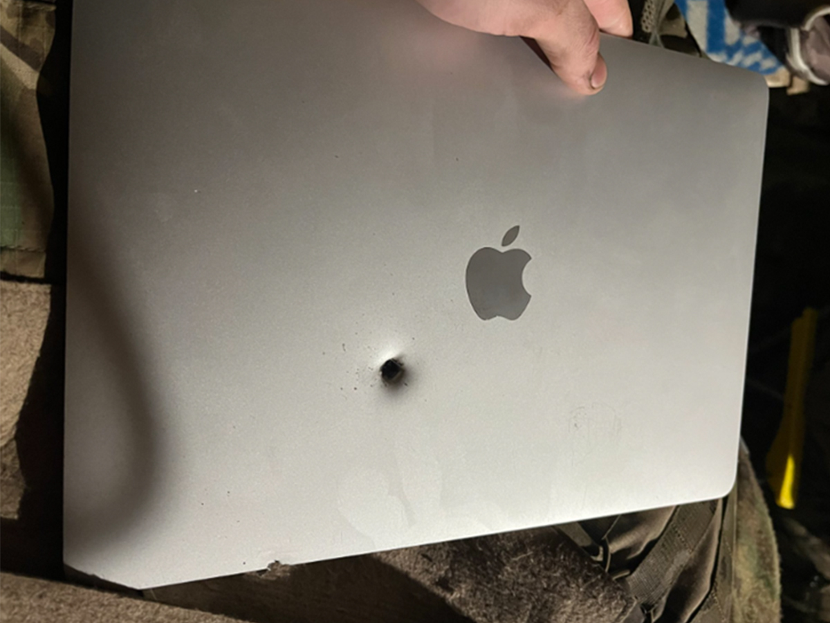 MacBook Air struck by artillery shrapnel. (Image credit – lanevychs on X)