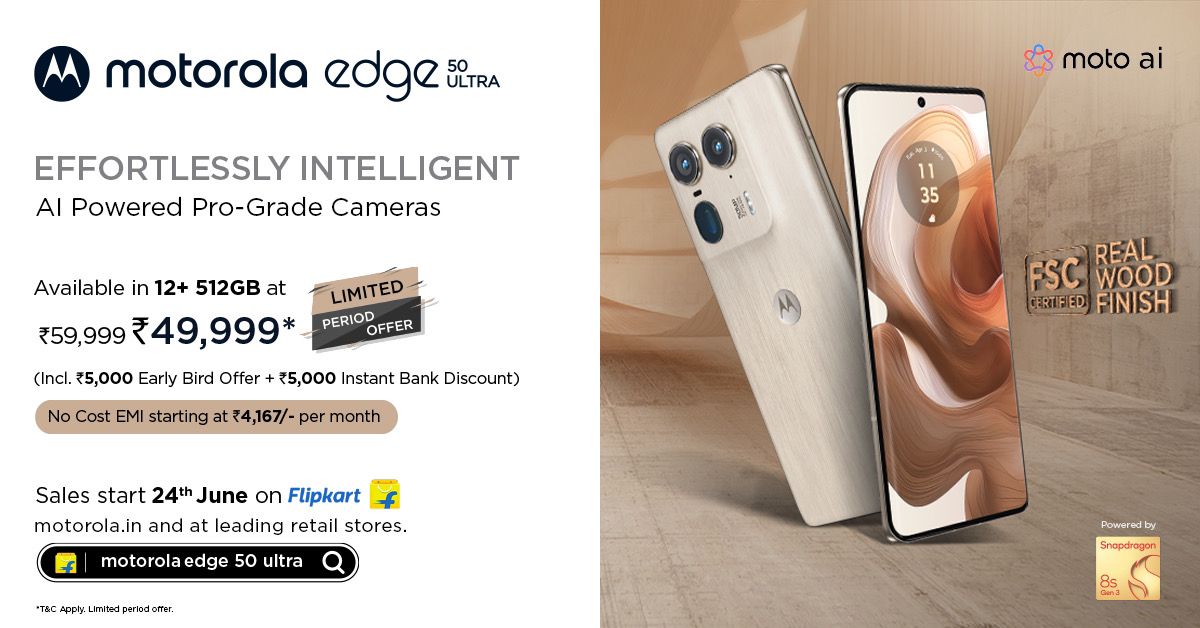 Speaking on the launch, Mr. T.M. Narasimhan, Managing Director, Motorola India said “At Motorola, we’re dedicated to excellence with each new release. The motorola edge50 Ultra represents a significant leap in AI-driven smartphone technology, marking our most advanced device to date. This phone underscores our dedication to meaningful innovation, extending beyond hardware. Packed with exceptional AI capabilities, a stand-out real wood inspired design, interconnected ecosystem experiences and more this device effortlessly redefines true flagship experience for Indian consumers. We’re confident that the motorola edge50 Ultra will deliver a revolutionary smartphone experience to our customers.”