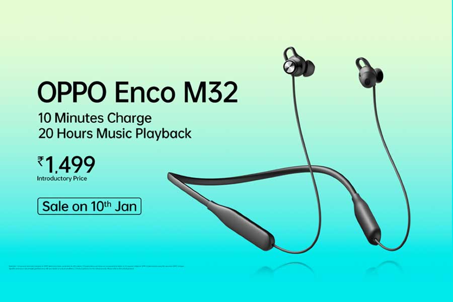 Smartphone brand Oppo today announced the availability of Enco M32, a wireless neckband that gives you up to 20 hours of playback on a 10-minute charge and up to 28 hours of listening after a flash charge of just 35 minutes. The Oppo Enco M32 will be available on Amazon and the Oppo store from January 10 till January 12 at an early bird discounted price of Rs 1,499.