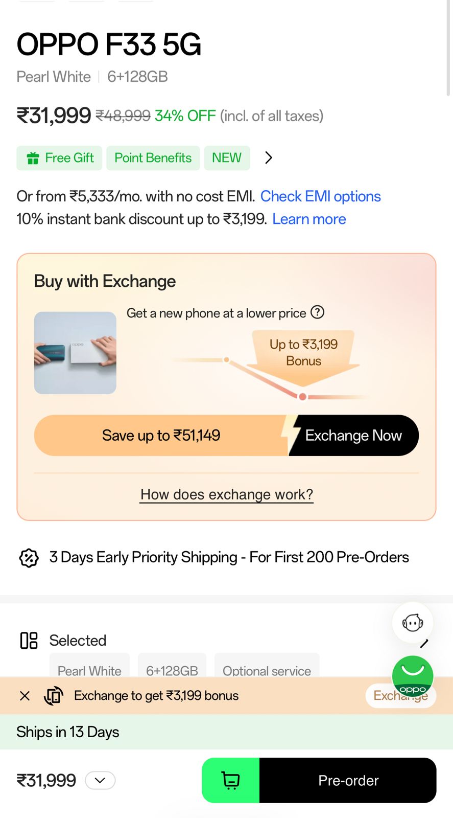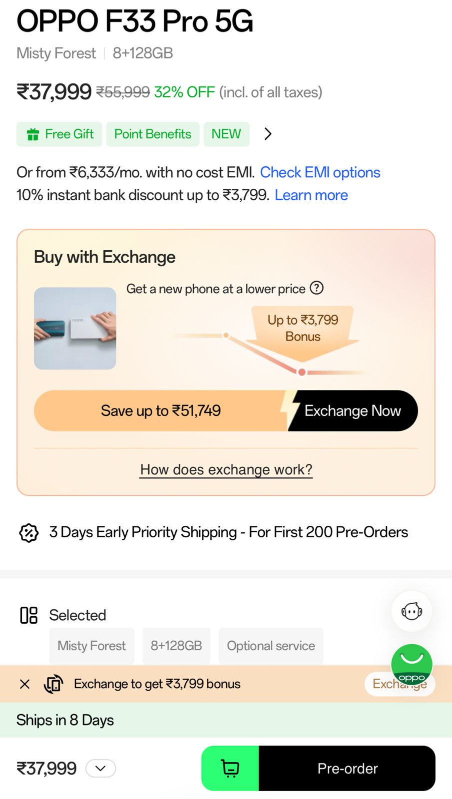 Oppo F33 price, on the other hand, starts at ₹31,999 for the base 6 RAM + 128GB storage variant. Other than that, the phone is also available in 8 RAM + 128GB storage and 8 RAM + 256GB storage options that cost ₹34,999 and ₹37,999, respectively. Colour options for this model include Pearl White and Forest Green.