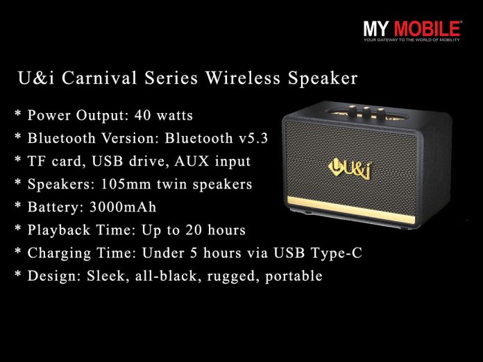 • U&i has announced its new Carnival Series Wireless Portable TWS Speaker. • The Speaker has Hi Fidelity sound with up to 20 hours of playback and twin-pairing for multi-room audio . • This speaker delivers 40 watts of powerful sound . • The Carnival Series includes a TWS Bluetooth V5.3 chip.