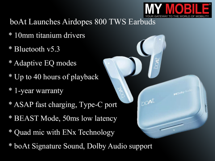 The boAt Airdopes 800 includes 10mm titanium drivers, Dolby Audio support, Quad mic with ENx Technology, and ASAP fast charging.