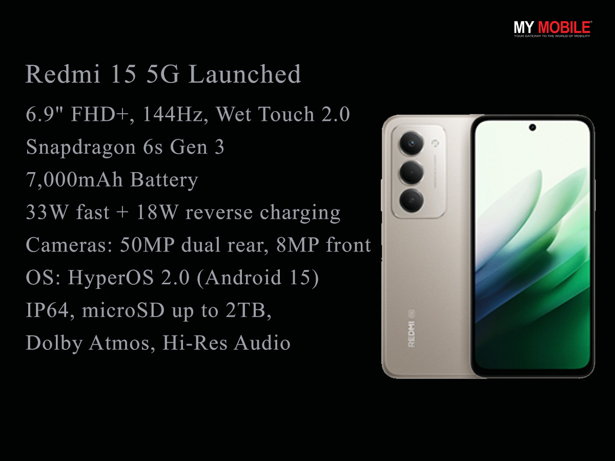 - Redmi 15 5G launched featuring a Snapdragon 6s Gen 3 processor, a 6.9″ Full HD+ display with 144Hz refresh rate and runs HyperOS 2.0 based on Android 15.