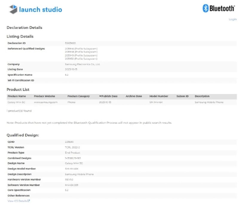 - Galaxy M44 5G showcases Bluetooth v5.2 support as per Bluetooth SIG Certification.
