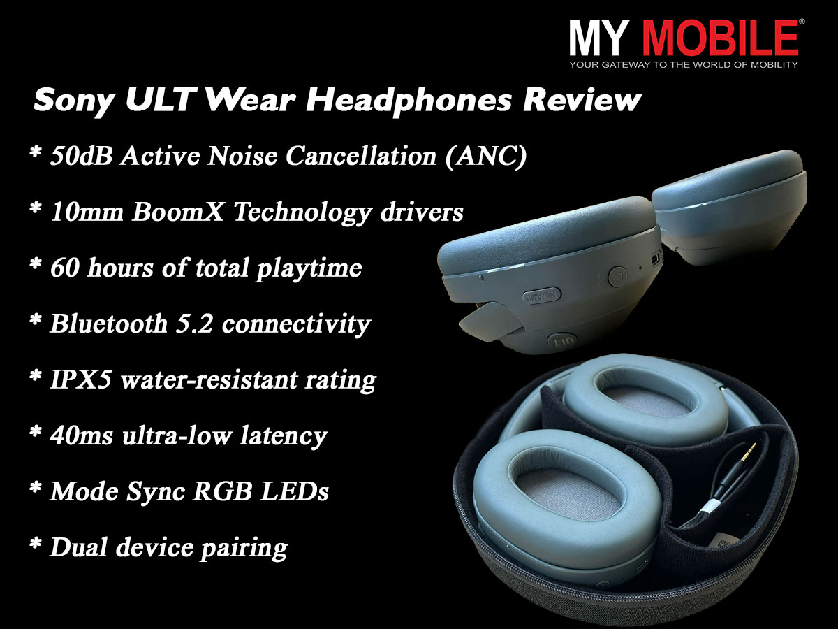 The Sony ULT Wear headphones feature 50dB active noise cancellation, 10mm BoomX technology drivers, 60 hours of total playtime, Bluetooth 5.2 connectivity, an IPX5 water-resistant rating, and dual device pairing with the Boult Amp app.