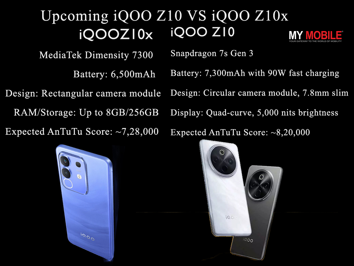 Answer. The iQOO Z10x features the MediaTek Dimensity 7300 chipset with an AnTuTu score of 7,28,000, while the Z10 is powered by the Snapdragon 7s Gen 3 chipset scoring 8,20,000 on AnTuTu.