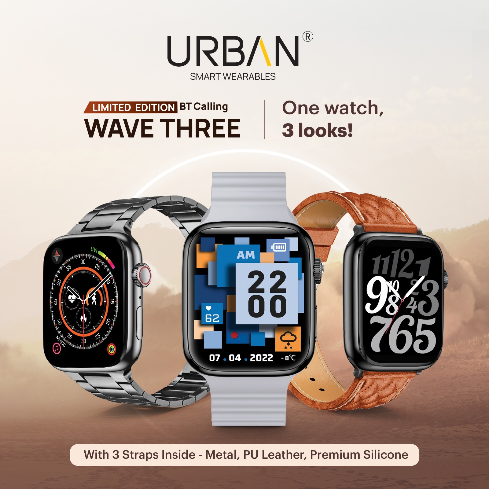 URBAN Wave Three Comes with a big 1.91” Super HD Display and 3 interchangeable Straps (Metal, PU Leather, Premium Silicone), advanced Bluetooth calling feature, AI Voice Assistant, Accurate Health Monitoring & more.