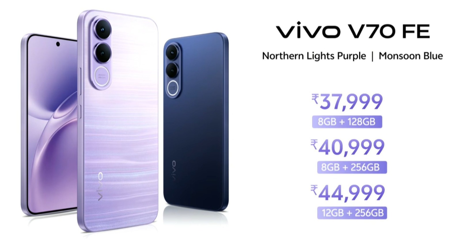 The Vivo V70 FE is available in three storage variants, which are 8GB RAM + 128GB Storage, 8GB RAM + 256 GB Storage and 12GB RAM + 256GB Storage. Here are the pricing details of three storage variants –