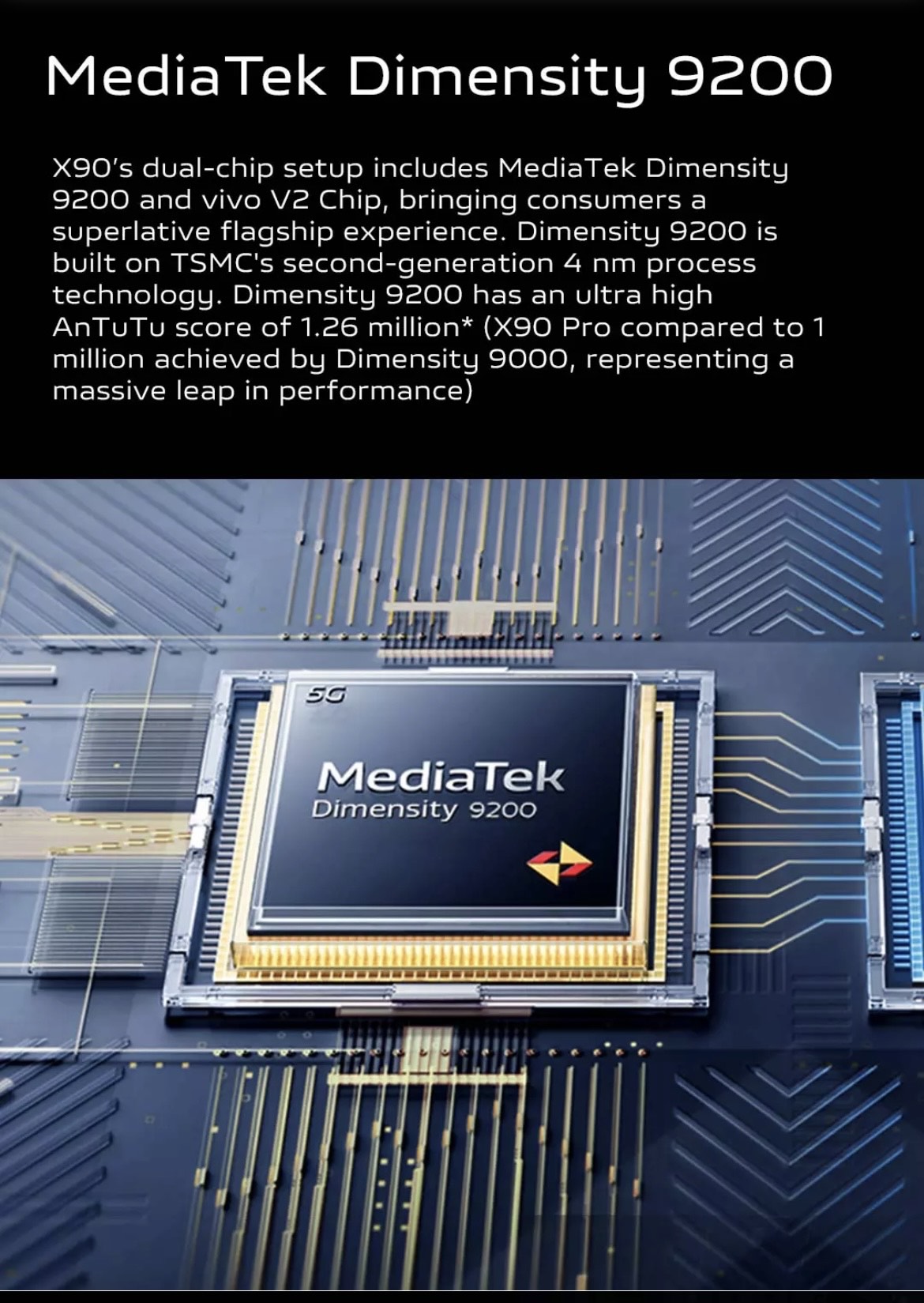 * Processor: The vanilla Vivo X90 and Vivo X90 Pro are powered by the MediaTek Dimensity 9200 chipset paired with Immortalis-G715.