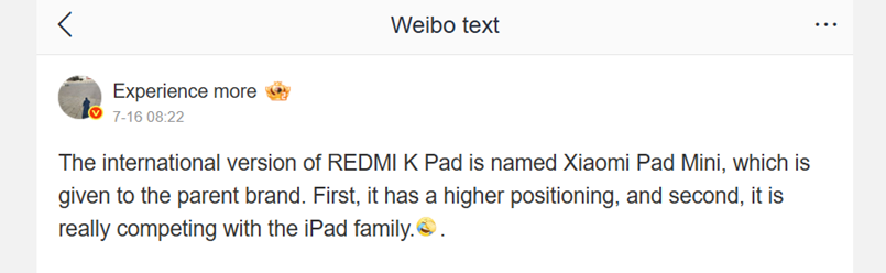 The latest leak comes from known tipster account Experience More on Weibo. The post says Xiaomi is reportedly planning to bring the Redmi K Pad to more regions outside China, but with a different name. The tablet may be introduced globally as the Xiaomi Pad Mini, positioning it as a direct competitor to devices like the iPad Mini.